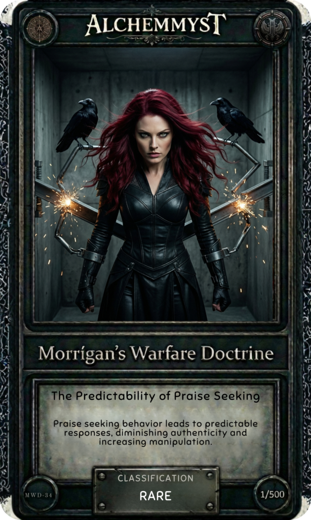 This is the Morrígan’s teaching on sovereignty in the age of external reward: the person who does not need the signal cannot be moved by it. That is not coldness. It is freedom. The action taken without seeking approval is the action that belongs entirely to you — uncontaminated by the anticipation of how it will land, undistorted by the performance of seeking.