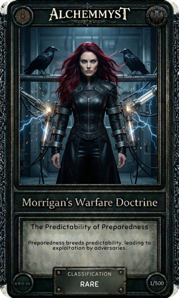 The Morrígan does not prepare by ritual. She prepares by reading the field. Before she moves, she assesses — not from a fixed checklist, but from the specific demands of the specific situation. What does this moment require that the last one did not? What angle has not been prepared against? What source has not been consulted? What form of readiness would be unexpected here? These are not the questions of someone who is less prepared. They are the questions of someone whose preparation cannot be catalogued, because they are always responding to the present conditions rather than executing a fixed sequence.